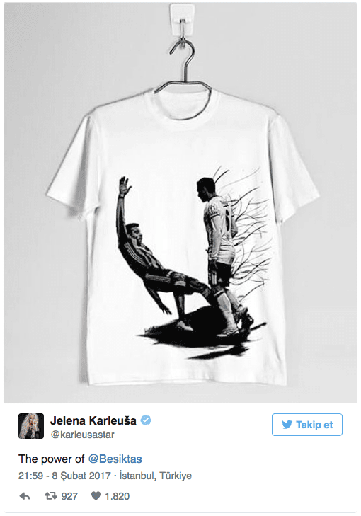 Jelena Karleusa, Robin van Persie'nin Beşiktaş maçındaki gol sevincini tişörtlere basan Fenerbahçe'ye taş attı. Karleusa, "Beşiktaş'ın gücü" yazarak Tosic'in kırmızı kart görmesine neden olan anın tişörte basılmış halinin fotoğrafını paylaştı.