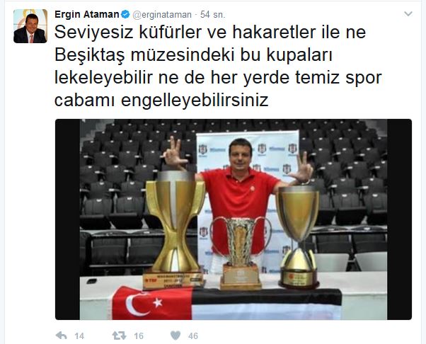 Galatasaray Odeabank antrenörü Ergin Ataman, olaylı bir şekilde sona eren Beşiktaş Sompo Japan maçı sonrası kendisine ait sosyal medya hesabından karşılaşma esnasında yaşanan olayları ve Beşiktaşlı taraftarları eleştiren bir yazı ve siyah beyazlı takımı çalıştırdığı dönem kazanılan 3 kupayla birlikte çekilmiş bir fotoğrafını paylaştı.