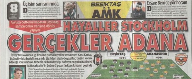 Ülkemizin iyi tirajlı spor gazetelerinden biri olan AMK'nin Beşiktaş sayfasının manşetinde "Hayaller Stockholm, gerçekler Adana" başlığını gören taraftarlar sosyal medyada paylaşımları ile tepkilerini dile getirdiler. Ayrıca haber içerisinde geçen "Avrupa defterini kapatan Beşiktaş tekrar şampiyonluk yarışına dönüyor" cümlelerine de kızan taraftarlar "Bu hangi yarış", "Bir gazete düşünün ismi AMK gerisi önemli değil", "Eğer biz yarı finale çıksaydık nasıl başlık atacaklardı acaba", "Öyle bir psikolojik üstünlük sağladık ki BEŞİKTAŞ'a cephe alayım derken TÜRK düşmanı olduklarının farkında değiller ...", "Bu daha iyi günleri, gün gelecek Beşiktaş'ı yazmak için besmele çekecekler." şeklinde yorumlara maruz kalan bu manşet hakkında AMK cephesinin ne açıklama yapılacağı merakla bekleniyor.