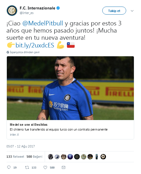 "Hoşacakal Medel. Birlikte geçirdiğimiz 3 yıl için teşekkür ederiz. Bir sonraki adımın için sana bol şans diliyoruz."