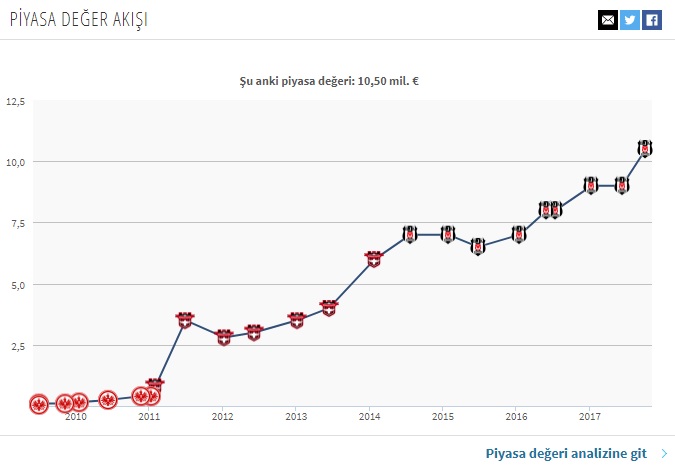 "Cenk Tosun'un kariyer sıçraması 2 Temmuz 2009'da Almanya'da daha henüz 18 yaşındayken Eintracht Frankfurt ile başladı. Transfermarket verilerine göre o dönem 50 bin euro gibi bir piyasa değer biçilen milli golcünün bugükü güncel değeri 10.5 milyon euro. Yani Cenk Tosun geçen 8 yılda değerini 200 katına çıkarmış durumda... "