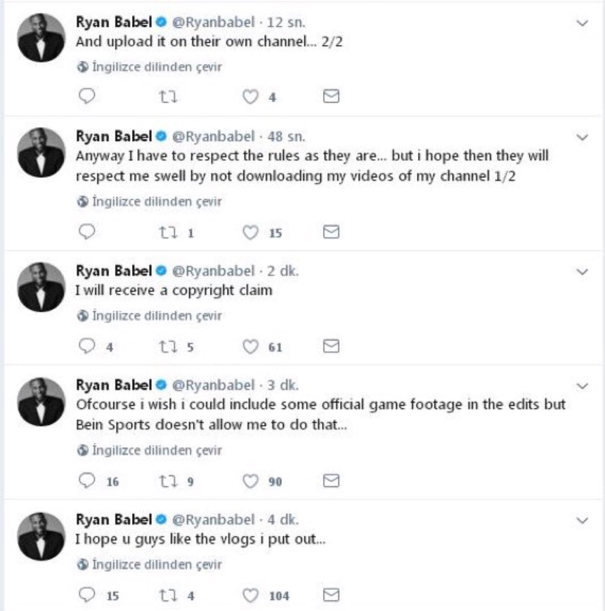 “Umarım vloglarımı beğeniyorsunuzdur. Tabii ki videolarımı kurgularken içerisine maç görüntülerini de koymak istiyorum ama beIN Sports buna yasal olarak izin vermiyor. Kurallara saygı duymak zorundayım. Bunun için telif hakkı talebi alacağım Ancak eğer yayıncı kuruluş maç görüntülerine izin vermiyorlarsa onlarda benim videolarımı indirip kendi kanallarına yükleyip kullanmasınlar..."
