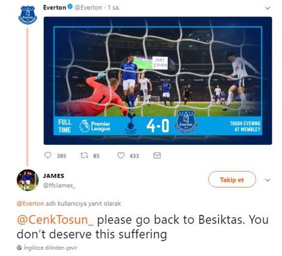Karşılaşmanın ardından alınan ağır yenilgiye rağmen sahada kaldığı sürede varını yoğunu ortaya koyan Cenk alkış alırken bir Everton taraftarının sosyal medyadan Cenk Tosun'a mesaj Everton sosyal medya üzerinden mesaj gönderdi..