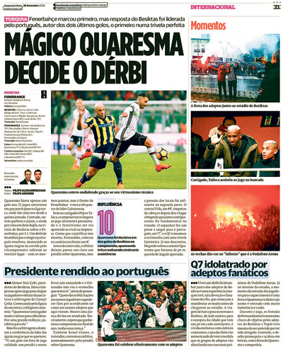 Manşette, “Quaresma’nın sihri derbinin sonucunu belirledi” ifadeleri kullanıldı. Maçın yazısı da tam sayfaya yayılırken, Portekizli yıldızın dev derbinin kahramanı olduğu ifade edildi.