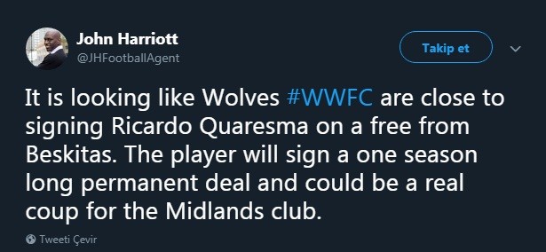 John Harriot sosyal medyadan yaptığı açıklamada Ricardo Quaresma - Wolves transferini duyurdu. FIFA eski menajeri paylaşımında, "Wolves, Ricardo Quaresma'yı Beşiktaş'tan bedelsiz transfer etmeye yaklaştı. Oyuncu 1 yıllık sözlşme imzalayacak. Wolves için gerçek bir transfer başarısı olacak." ifadelerini kullandı.Ricardo Quaresma, Beşiktaş'ın geçen gün Riva'da başlayan yeni sezon idmanlarında yer aldı. Portekizli yıldız antrenmanda neşeli tavırlarıyla dikkat çekti. Ricardo Quaresma'nın geleceğinin yakın zamanda netleşmesi bekleniyor.