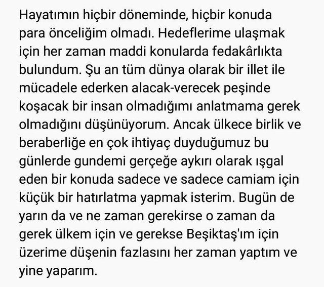 "Hayatımın hiçbir döneminde, hiçbir konuda para önceliğim olmadı.Hedeflerime ulaşmak için her zaman maddi konularda fedakarlıkta bulundum. Şu an tüm dünya olarak bir illet ile mücadele ederken alacak-verecek peşinde koşacak bir insan olmadığımı anlatmama gerek olmadığını düşünüyorum. Anca ülkece birlik ve beraberliğe en çok ihtiyaç duyduğumuz bugünlerde gündemi gerçeğe aykırı olarak işgal eden bir konuda sadece ve sadece camiam için küçük bir hatırlatma yapmak isterim. Bugün de yarın da ve ne zaman gerekirse o zaman da gerek ülkem için ve gerekirse Beşiktaş'ım için üzerime düşenin fazlasını her zaman yaptım ve yine yaparım" (Fanatik)