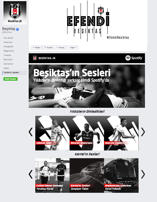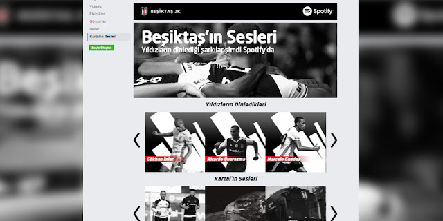 Spotify Kartal’ın Sesleri sayfasında takımın idman yaparken ve deplasmana giderken kulüp otobüsünde dinlediği şarkılar gibi çalma listeleri de yer alıyor. Ayrıca siyah beyazlı taraftarlar takımın tüm marşlarına da artık tek bir tıkla ulaşabiliyor.